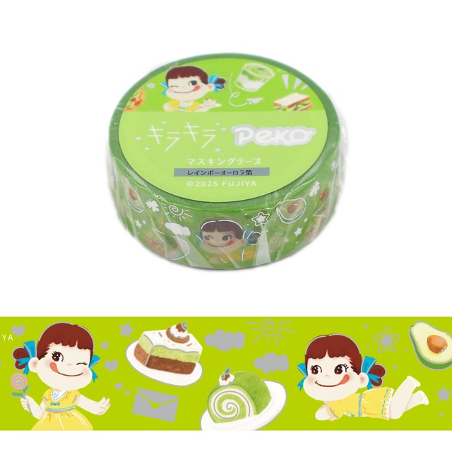 【ワールドクラフト】「Peko Delicious Garden キラキラマスキングテープ15㎜×5m【 ◇◇人気のキラキラシリーズに新たにペコちゃんが登場!◇◇ 甘〜いスイーツの世界を華やかな箔押しが彩ります。 手帳やノートなどのデコレーションに! #FUJIYA# 【素材・成分】 紙、レインボーオーロラ箔 【生産地】 中国