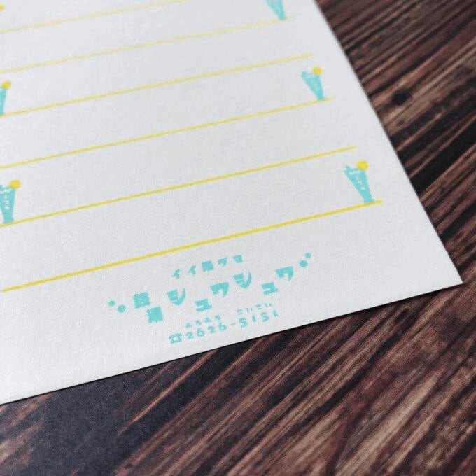 レモンスカッシュの一筆箋ですリソグラフ印刷の2色刷りは発色がとても素敵です。黄色とミントカラーで仕上げました