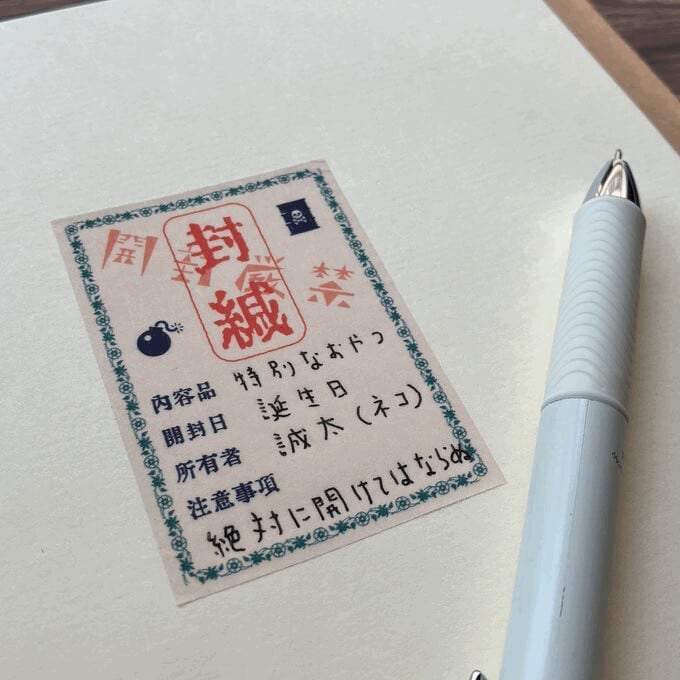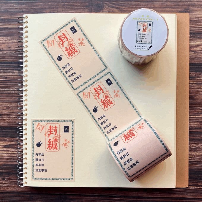 封緘紙風のメモマスキングテープです。内容品、開封日、所有者、注意事項の記入欄があります。 水性ボールペンでインクが弾くことなく筆記出来る特殊加工しており、ミシン目入りで手で切ることが出来ます。貼って剥がせる特性を生かし、ノート以外の日用品などにも貼って使用して頂けます。